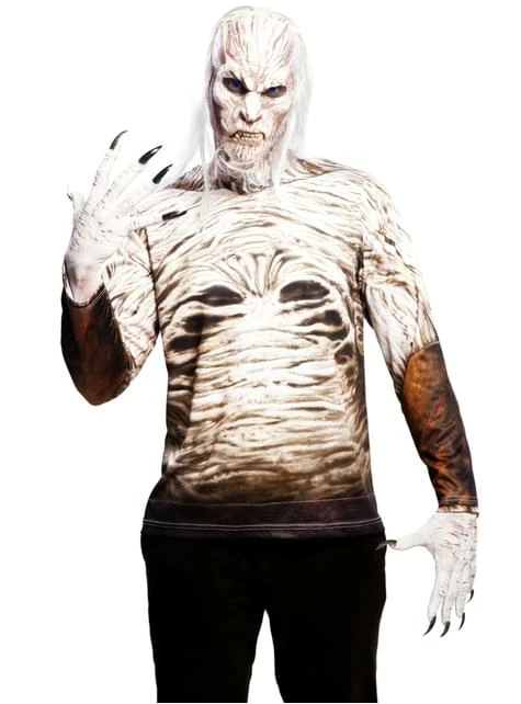 Incluye una camiseta blanca y marrón de manga larga con un estampado de arañazos, piel a tiras y unas ranuras inquietantes a modo de ojos en la parte central, idéntico al Caminante Blanco de Juego de Tronos.