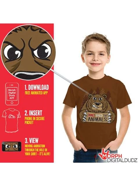 Descárgate en tu teléfono móvil la app gratuita: «Morph DigitalDudz»; mete tu dispositivo en el bolsillo de seguridad de la camiseta y estarás listo para inquietar a todo el mundo con este oso hambriento