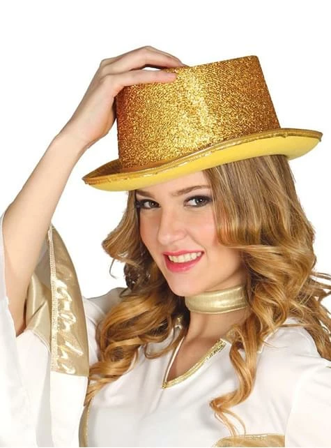 Completa tu disfraz y dale un toque de brillo con esta chistera dorada brillante.