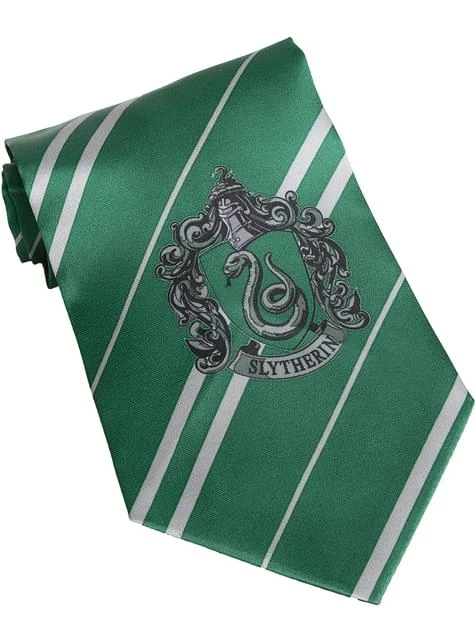 El animal emblemático de la casa es una serpiente y sus colores son verde y plateado, colores que luce esta corbata Slytherin. Con esta corbata de Slytherin made by Funidelia conseguirás completar tu disfraz de mago, siendo el centro de todas las miradas entre los asistentes de tu próxima fiesta de disfraces.