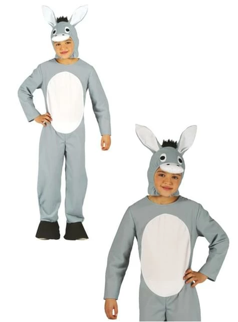 Este disfraz de burro incluye un mono gris y un gorro con la forma de la cabeza del animal.