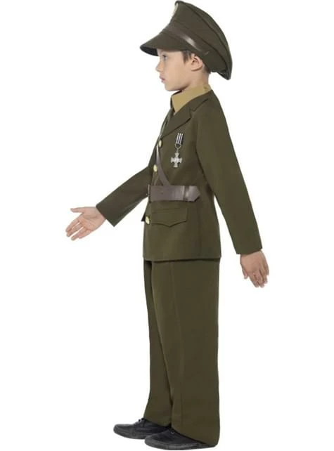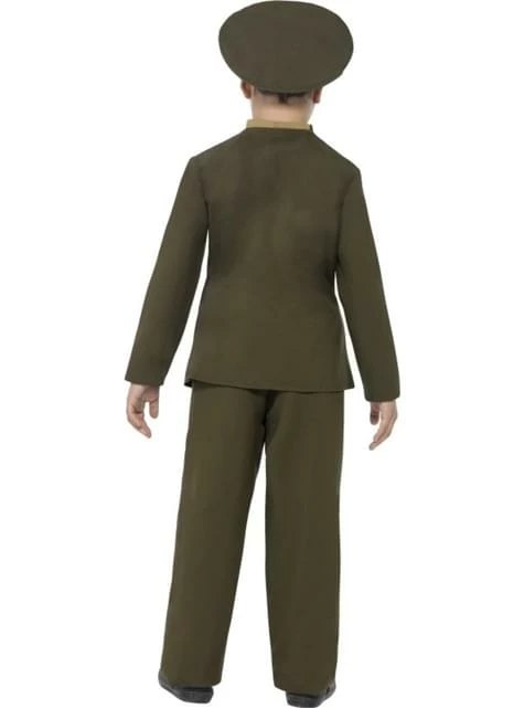 Este increíble disfraz de capitán del ejército incluye una chaqueta militar color verde con cinturones color marrón adjuntos, pantalones color verde, sombrero color verde y una camisa y una corbata también verdes.