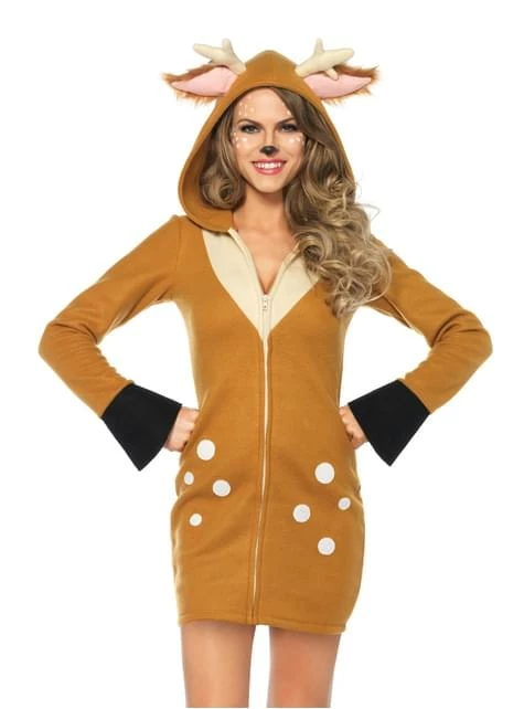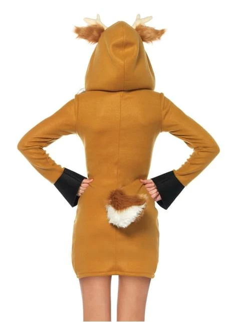 Incluye vestido de felpa con cremallera frontal y capuchón con orejas y cuernos de ciervo y colita.