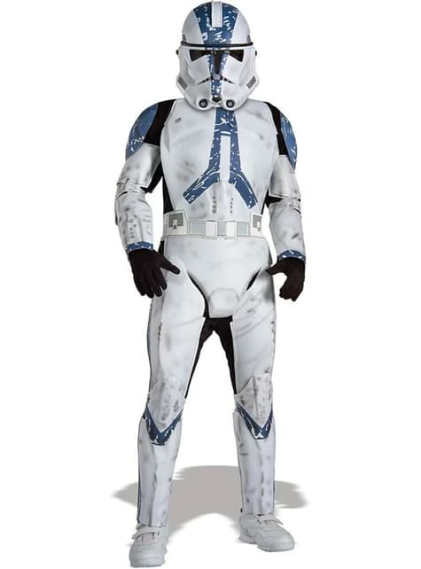Este magnífico disfraz incluye un mono de color blanco con piezas moldeadas de la armadura de los soldados clon, en colores azules y negros, un cinturón blanco y una genial máscara de color blanco y azul.