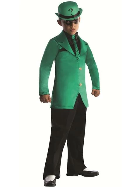 Crea acertijos con los que demostrar tu superioridad intelectual frente a Batman y lucha por el mal con este disfraz de Riddler DC Comics para niño.