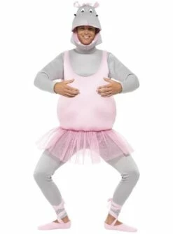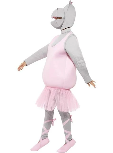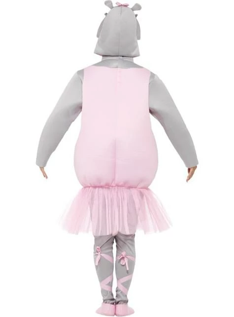 Este irreverente disfraz de hipopótamo incluye un mono gris y rosa que simula un vestido de ballet, relleno de espuma, un pantalón gris a juego, una pieza para la cabeza gris con el rostro de un hipopótamo y unos cubrebotas rosas.