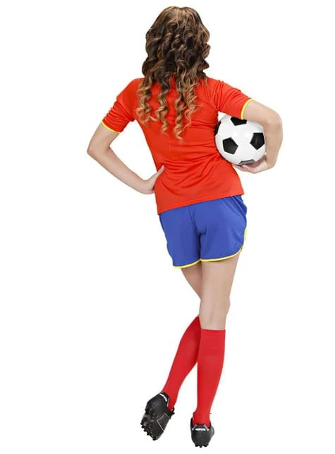 Este atractivo disfraz de jugadora de fútbol Español incluye una camiseta color rojo y unos pantalones cortos color azul con el detalle de la bandera de España.