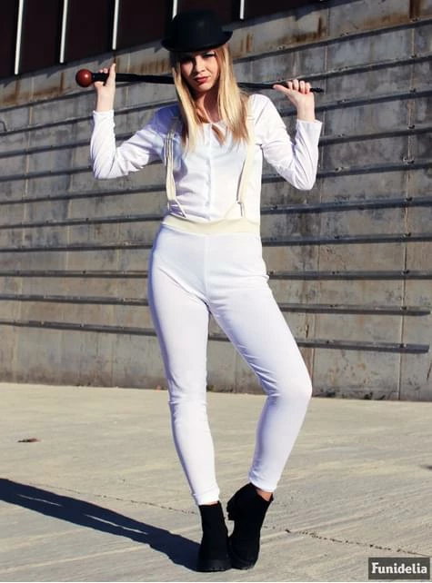 Esta película de Kubrick consiguió crear una estética tan característica que este traje es fácilmente reconocible. Bombín negro, maquillaje en los ojos y un mono blanco con tirantes forman el disfraz de la Naranja Mecánica perfecto.