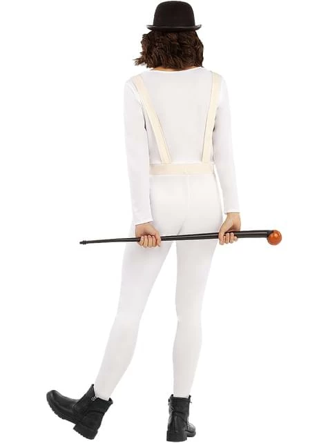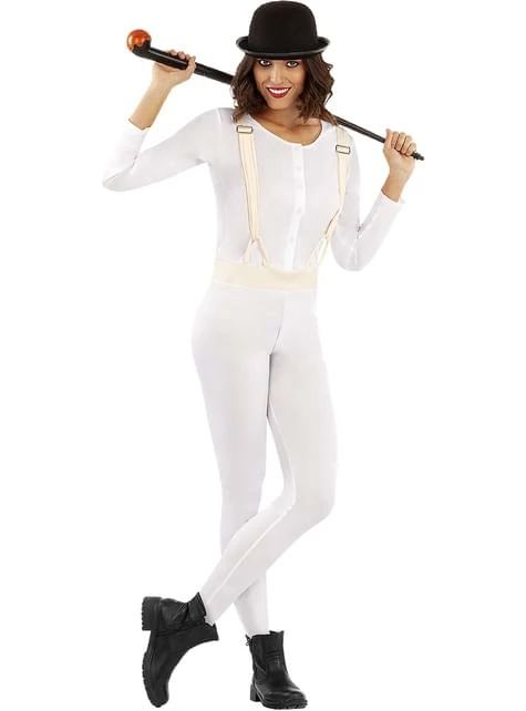 Y ahora tu podrás convertirte en el mismísimo Alex DeLarge con este traje de la Naranja Mecánica para mujer: compuesto por un mono blanco de cuerpo entero y tirantes.