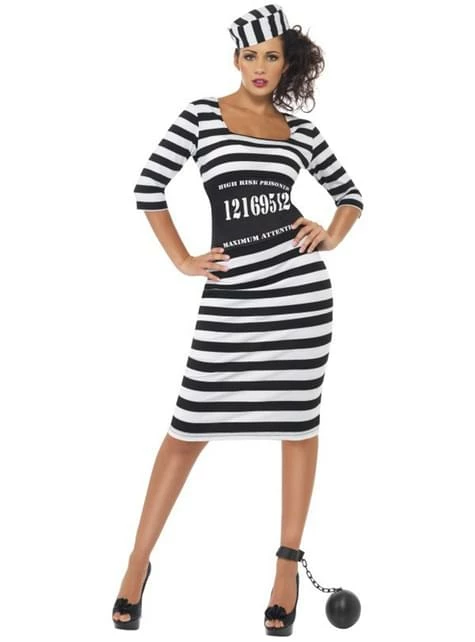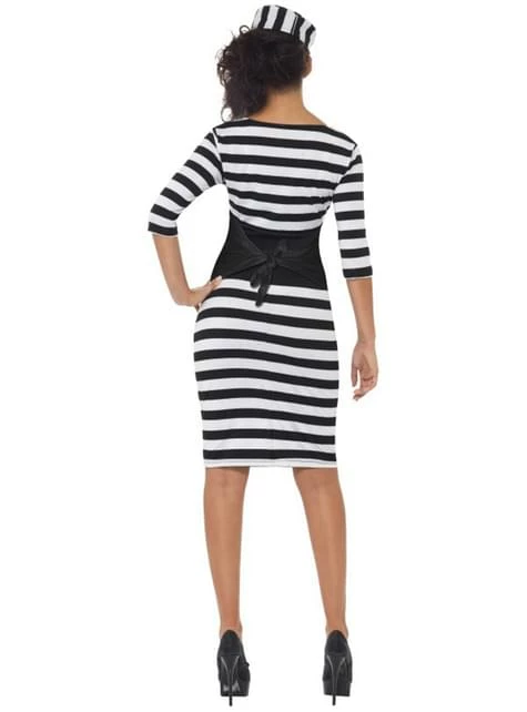 Incluye un vestido de rayas negras y blancas, un ceñidor de cintura y un gorro a juego.