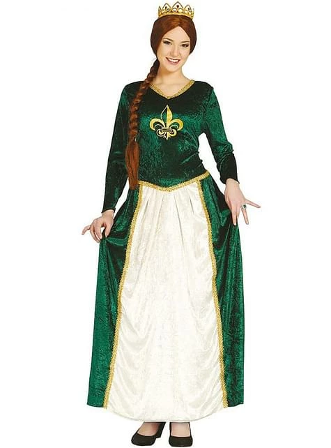 Este suave disfraz de princesa de ciénaga recuerda al de Fiona de la película Shrek, incluye un vestido verde largo de terciopelo con la parte delantera de la falda en color crudo, detalles en dorado y la flor de lis dibujada en el pecho.