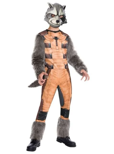 Este increíble disfraz de Rocket Racoon incluye un mono naranja con pelo en las mangas y en las piernas y cola incorporada y una increíble máscara con la cara del mapache.