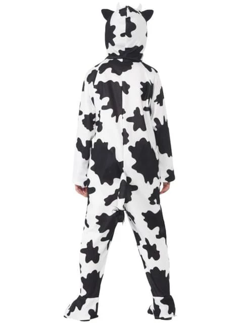 Este hermoso disfraz de vaca divertida incluye un mono color negro y blanco con detalles de manchas de vaca y una capucha a juego con la forma de una cabeza de vaca.