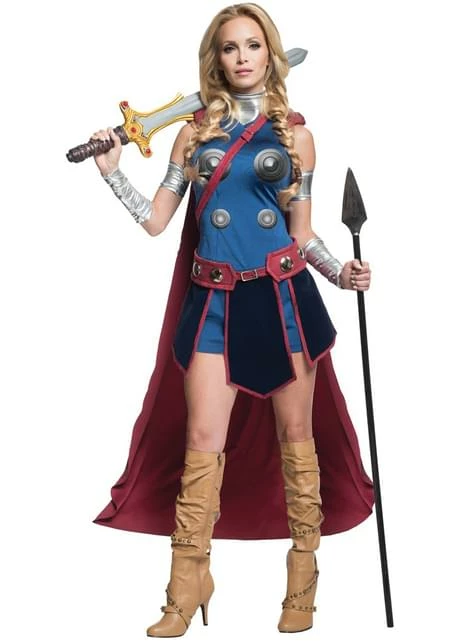 Este increíble disfraz de Valquiria incluye un vestido color azul con detalles plateados, una capa roja, un cinturón rojo con detalles azules y plateados, muñequeras plateadas y brazaletes también plateados.