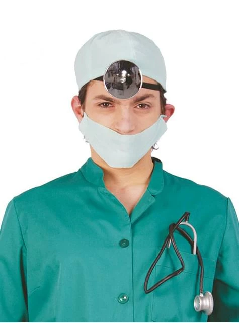 Incluye una mascarilla gris, un gorro gris y un estetoscopio.