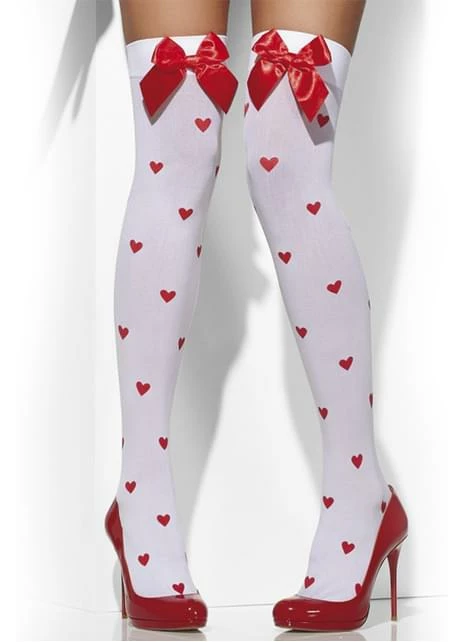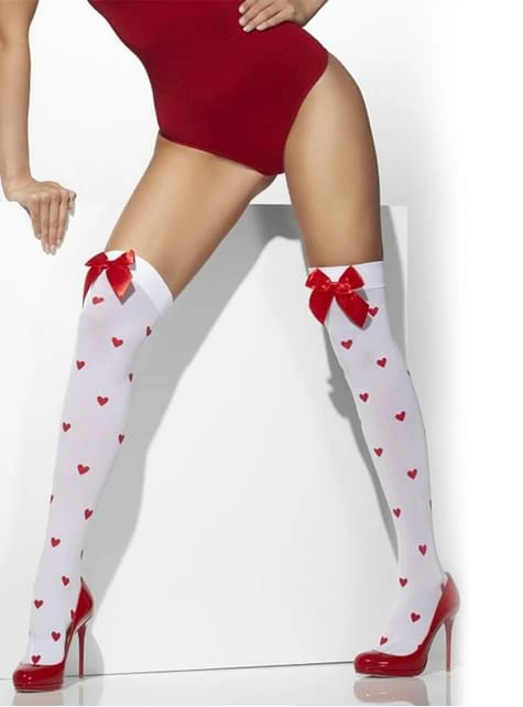 Completa tu disfraz y dale un toque sexy con estas medias de corazones con lazos rojos.