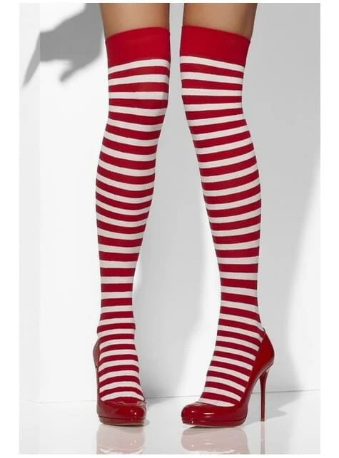 Completa tu disfraz y dale un toque sexy con estas medias de rayas blancas y rojas.