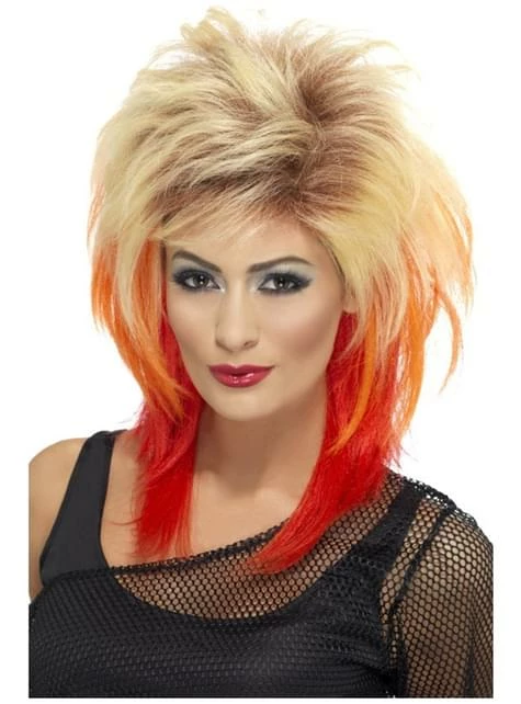 Incluye una peluca de corte mullet de color rubio con vetas rojas.