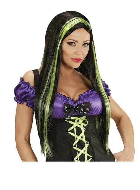 Incluye una peluca larga negra con mechas verdes en la parte del flequillo.