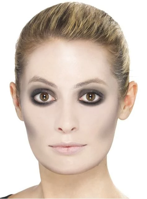 Incluye maquillaje facial en tonos oscuros, barra de labios y pestañas postizas.