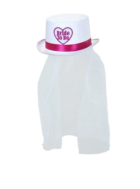 Incluye un sombrero blanco con las letras “bride tu be” en rosa fucsia, con una cinta de ese color y un velo blanco incorporado.