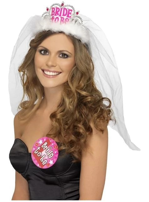 Incluye una tiara con velo blanco y el mensaje “futura novia” en lo alto.