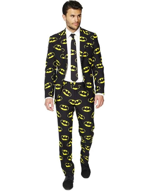 Ya sabíamos que Bruce Wayne es un elegante multimillonario, pero no podía demostrar toda su clase cuando se vestía de Batman. Ahora podrá hacerlo, y tú también con este elegante traje de chaqueta, pantalón y corbata negro con el logotipo amarillo de Batman estampado en todo el traje y la corbata.