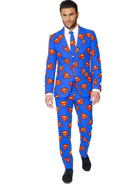 ¿Quieres ser un superhéroe sin perder la elegancia? Con este traje de Superman Opposuits serás el superhéroe con más porte de la fiesta. Incluye un traje azul estampado con el logotipo de Superman en la chaqueta, pantalón y corbata.