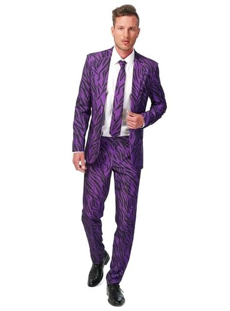 Saca tu lado mas salvaje pero sin perder la elegancia que te proporciona este Traje Pimp Tiger en morado con estampado negro que incluye chaqueta, pantalón y corbata.