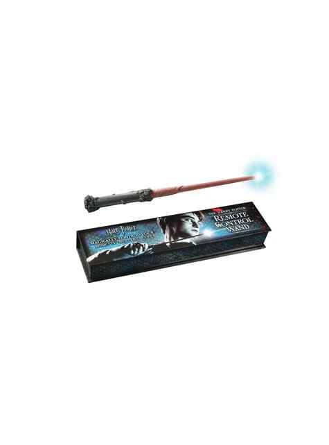 Varita de Harry Potter mando a distancia capaz de controlar cualquier aparato operado por control remoto con un simple golpe de muñeca. Presentada en caja decorada y configurable siguiendo las instrucciones. Pilas no incluidas.